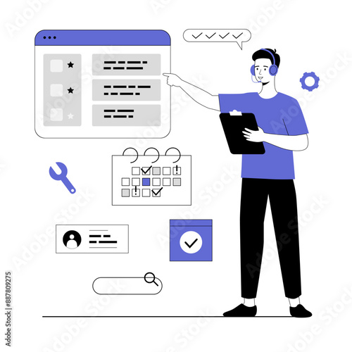 Support staff help solve technical problems. Help desk operator with headset talking to customer helping in computer problems. Vector illustration with line people for web design.