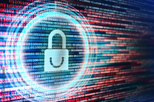 surfing dangerous internet environment. Blue padlock icon on red and blue binary bit code background. data security in hacker prone crime network. protection against virus.