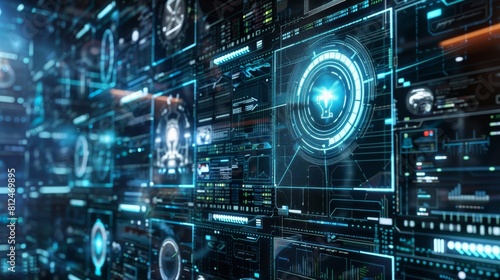 Surveillance CCTV and a futuristic interface with detection screens