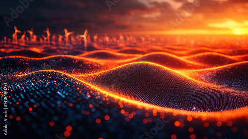 Sustainable energy flow texture with AI-optimized solar grid networks, wind turbine power simulation waves, and futuristic eco-tech overlays