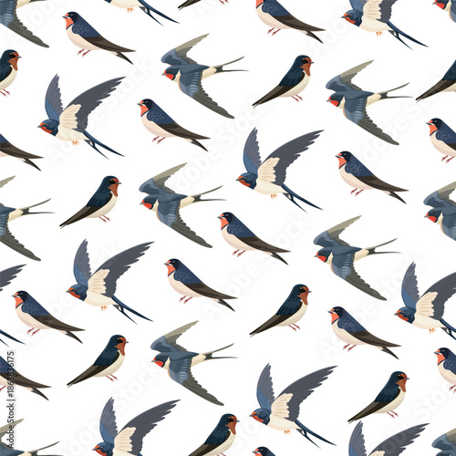 Swallow seamless pattern. Flat vector clipart, illustration with isolated background.
