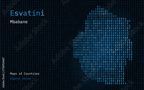 Swaziland, Eswatini Map Shown in Binary Code Pattern. TSMC. Blue Matrix numbers, zero, one. World Countries Vector Maps. Digital Series