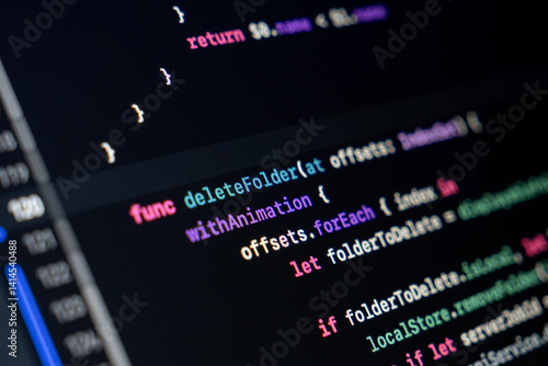 Swift function code on screen showing folder deletion logic with animation and loop structure