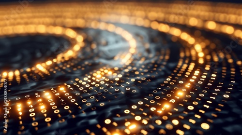 Swirling patterns of glowing binary code create an abstract digital landscape at night