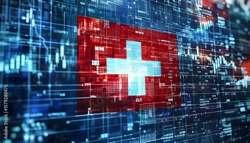 Swiss flag, finance graphs, market view.