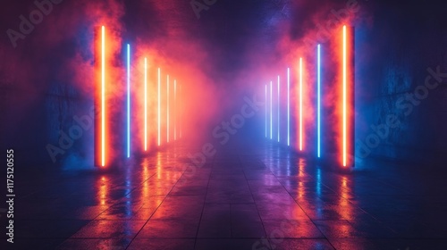 Symmetrical Neon Lights in Industrial Space. Generative AI