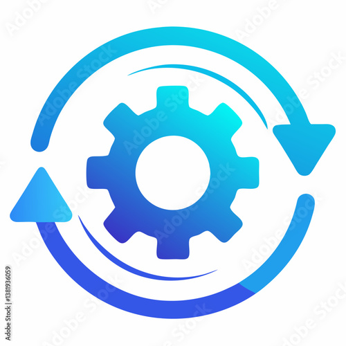 Sync Settings Icon – Blue Gradient Gear with Play Symbol and Circular Arrow Representing Continuous Process on White Background