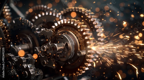 Synchronized gears rotate rapidly, producing fiery sparks that illuminate the intricate design and precision of the mechanical system