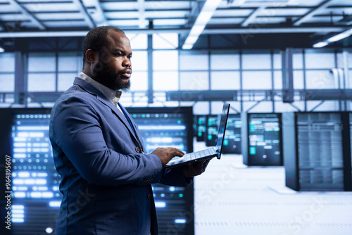 System administrator in data center implementing backup solutions to protect against data loss using laptop, ensuring efficiency. High tech facility worker resolving technical issues using notebook