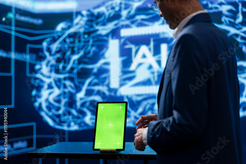 System administrator in startup doing advancements in AI field using chroma key tablet. Green screen device used by IT professional working in high tech lab featuring artificial intelligence
