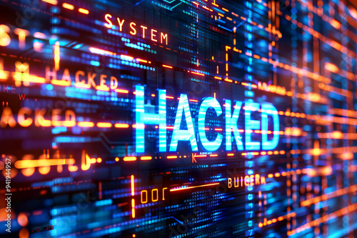 System Hacked message on a digital interface with glowing binary code indicating a cyberattack