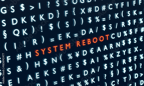 System reboot symbol in red between encrypted data. System configuration, computer, server, network, security, digital data, encryption. 3D illustration