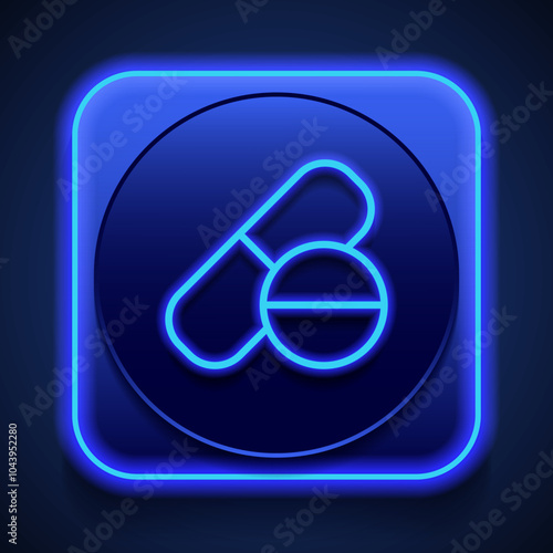 Tablet and pill simple icon vector. Flat design. Blue neon style on button. With shadow