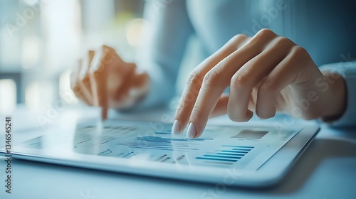 Tablet Displaying Data Analytics in Modern Office, Person using a tablet displaying data analytics and graphs in a modern office setting