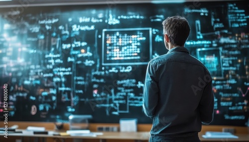 Teacher in front of a blackboard with glowing holographic notes, modern classroom setting, bright lighting, photorealistic