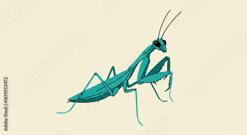 Teal Praying Mantis Illustration on Cream Background Detailed Insect Anatomy.