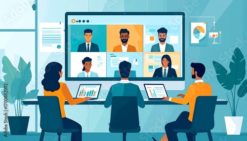 Team collaborating remotely during video conference in modern office setting today