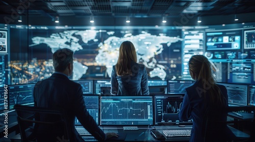 Team of professionals working in a high-tech control room with multiple monitors, analyzing global data and trends.