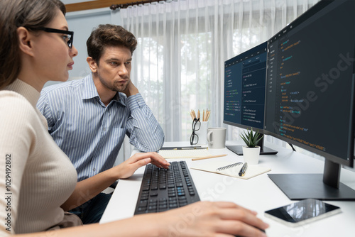 Team skilled developers program thinking newest coding creative website planning software project on two pc screen, comparing with typing full stack data analyzing prompt design at office. Postulate.