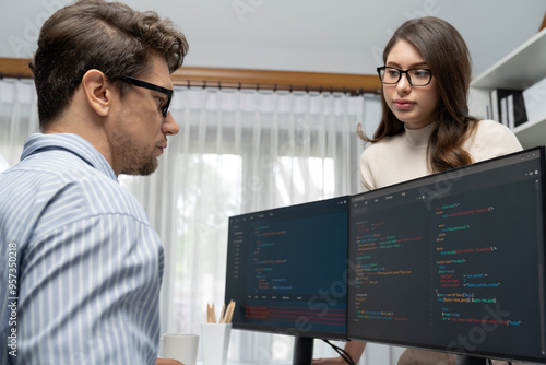 Team skilled developers program thinking newest coding creative website planning software project on two pc screen, comparing with typing full stack data analyzing prompt design at office. Postulate.