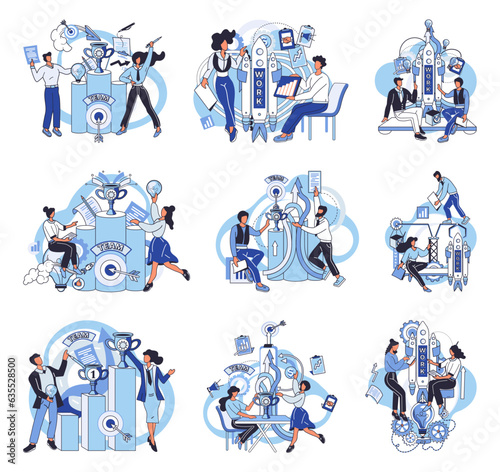 Team solving problems. Data scientists, software engineer, statistician, programmers, visualizer and analyst working on a project Problem solving skills abstract concept People communication in search