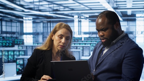 Teamworking colleagues in server farm using laptop to patch network issues affecting transfer rates. Coworkers in data center doing brainstorming, fixing errors affecting supercomputers, camera A