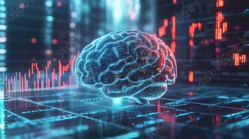 Tech finance concept, AI brain with data charts, 3D illustration.