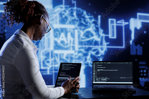 Tech support updates neural networks made of interconnected nodes, writing intricate binary code scripts on tablet and laptop. Server hub employee uses programming to upgrade AI simulation model