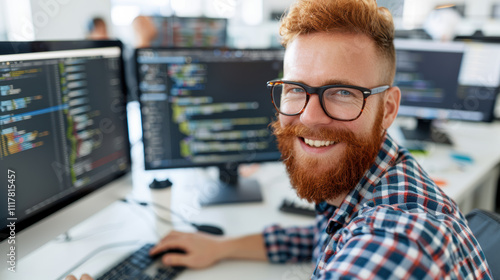 Tech user smiling while interacting with secure digital software, A cheerful programmer smiling at his desk with multiple monitors displaying code, showcasing a positive work environment.