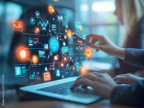 Tech Visionaries: Business professionals collaborating on a laptop, interacting with an array of digital icons symbolizing interconnected networks, data streams, and technological advancements.