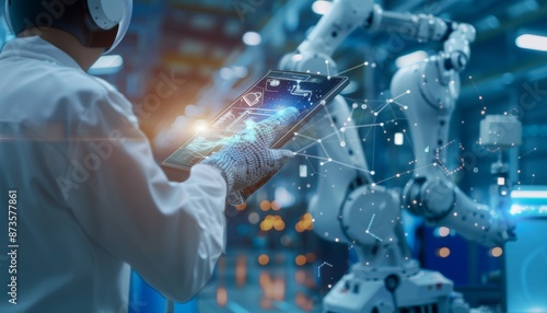 Technical industrial engineer managing robotics and ai automation with network monitoring on tablet