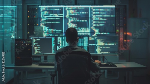 Technical room of data center. IT specialist on personal computer with monitors showing coding language program.