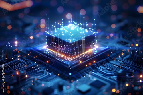 Technology abstract background of a quantum computing system with electronic circuit and processor. Neurons artificial, connections data global.