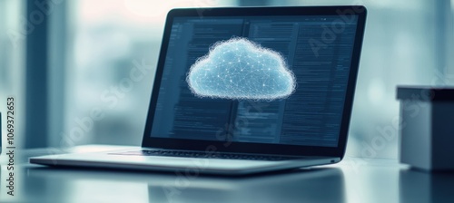technology being used by an IT professional to create a digital document, with icons of basic file shapes on the laptop screen symbolizing data integration in a cloud management platform Generative AI