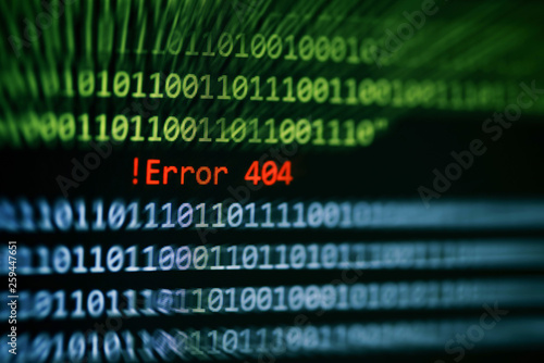 Technology binary code number data alert ! Error 404 message on display screen / Computer network system problem error software