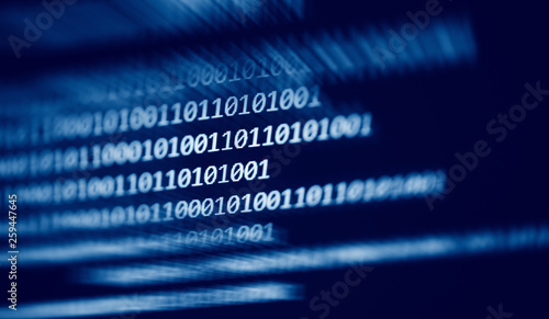 Technology digital binary code data number 0 and 1 on computer screen blue dark background