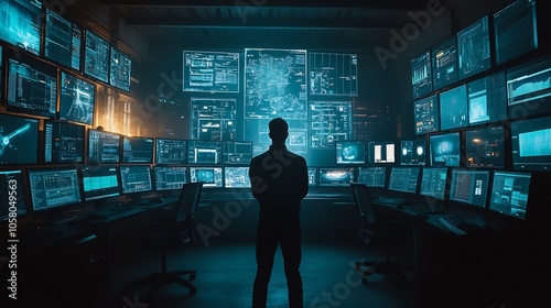 Technology Expert Stands In High-Tech Command Center With Multiple Screens Displaying Complex Data Systems : Generative AI