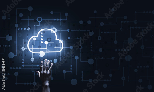 Technology idea concept with glowing cloud icon and touching it finger
