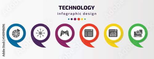 technology infographic template with icons and 6 step or option. technology icons such as color value, frameworks, video game controller, attributes, data visualization, website optimization vector.