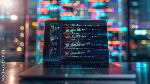 Technology of Software development, web design, programming concept. Program code on screen laptop, phone, code of program, data, interface elements on screen laptop. Software development Tech Banner