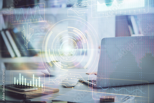 Technology theme drawing and work space with computer. Multi exposure. Concept of innovation.