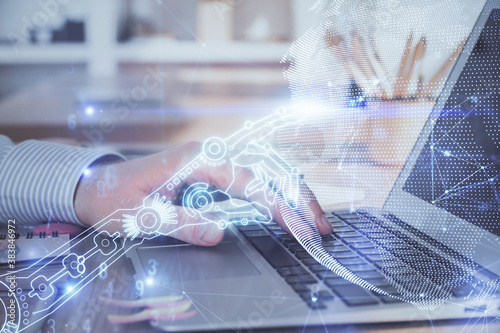 Technology theme hologram with man working on computer on background. High tech concept. Double exposure.