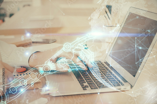 Technology theme hologram with man working on computer on background. High tech concept. Double exposure.