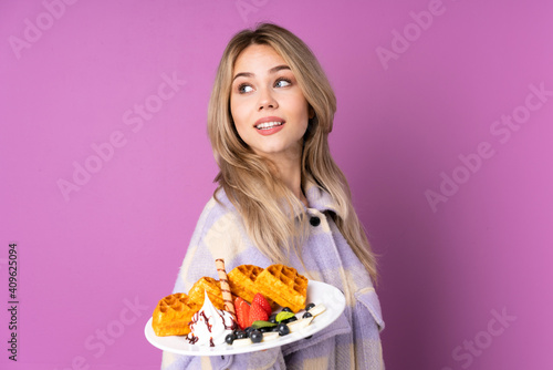 Teenager Russian girl holding waffles isolated on purple background with arms crossed and happy