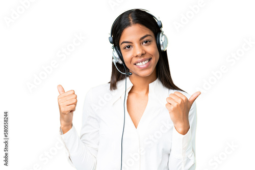 Telemarketer African American woman working with a headset over isolated chroma key background with thumbs up gesture and smiling