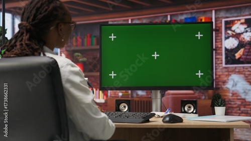 Teleworker at home using isolated screen PC display during job shift, analyzing data at desk, compiling reports. Remote worker doing tasks on chroma key computer, typing information, camera B