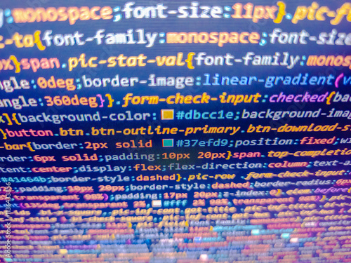 Template of website, selective focus. Background to programmers job offer. Green binary code on computer screen texture background. Programming code on computer screen. Code background.