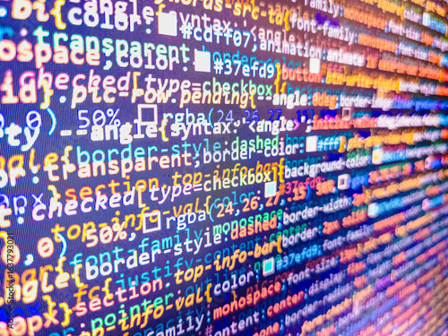 Tensorflow AI concept. Server logs analysis. Strong vintage effect. Modern web development background. Coding programming source code screen. Screen of web developing php code on dark background