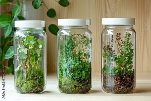 Terrariums with herbs and moss. Three glass jars filled with small plants, moss, and soil, creating miniature gardens