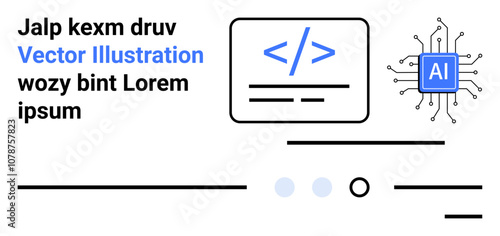 Text elements, coding symbol in rectangular box, AI microchip, lines, dots. Ideal for technology, coding, artificial intelligence, programming web development software engineering digital